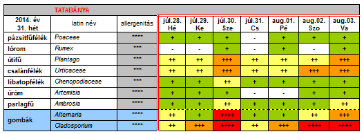 Az OKI Aerobiológiai Hálózatának Tatabányára vonatkozó 31. heti jelentése