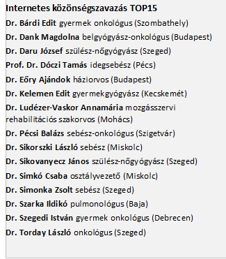 A lista élén az első 20 helyen jelenleg a szürke mezőben felsorolt jelöltek állnak (a listában szereplő orvosok neveit nem az aktuális helyezés, hanem ábécé-rend szerint közöljük).