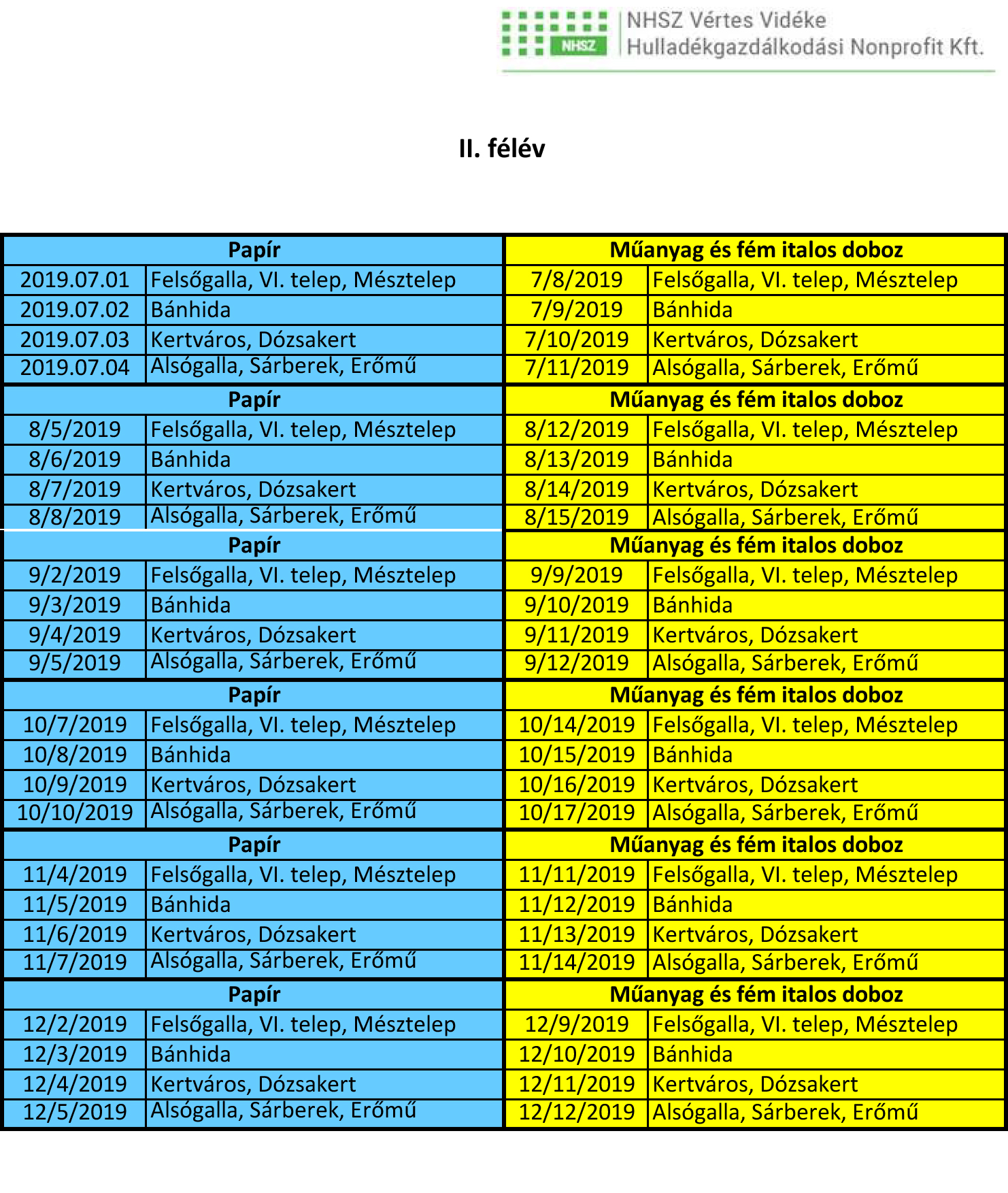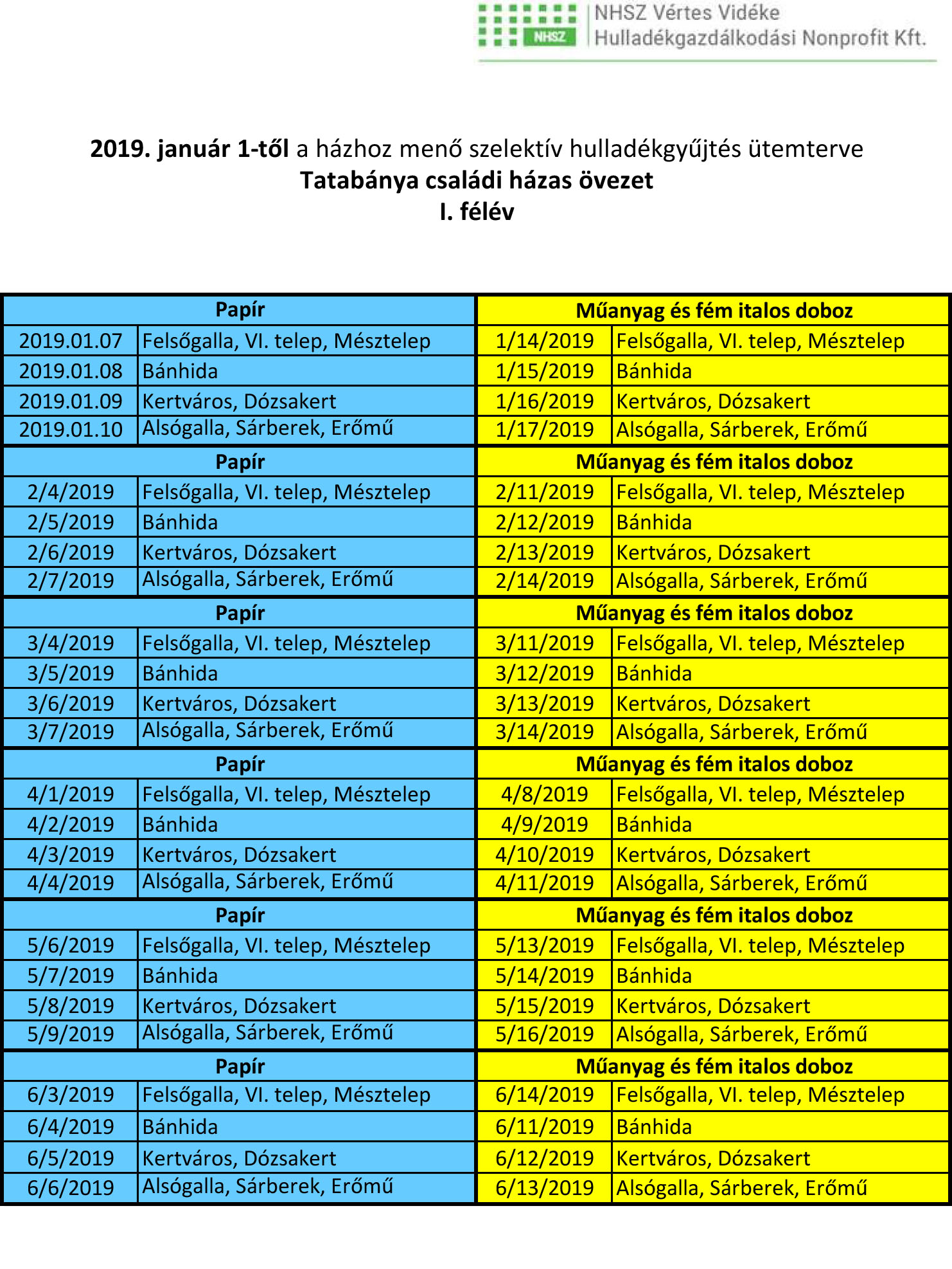 Tatabánya 2019 évi szelektív hulladék elszállítási időpontok