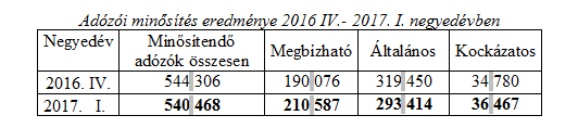 A NAV az első negyedévben több mint félmillió (540468) adózót minősített. Csaknem 40 százalékuk (210587) mondhatja el magáról, hogy megfelelt a megbízhatóság valamennyi feltételének.
