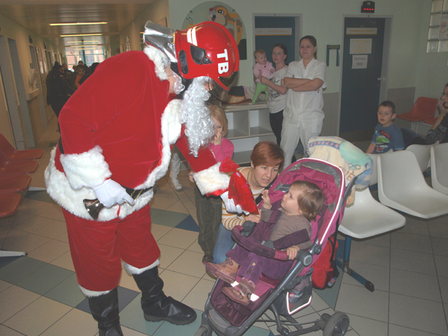 A hétvégi hajszában kiürült a puttonya, ezért a Tesco Tatabánya Hipermarketben töltötte fel zsákját minden jóval, mogyoróval. Mivel a gyermekrészleg a kórház emeletén található, ezért a Tatabányai Hivatásos Tűzoltó-parancsnokság segítségét kérte, hogy immár tűzoltómikulásként adhassa át csomagjait a gyermekosztályon gyógyuló kis lurkók részére. A gyermekek körben álltak a szobában és énekkel várták a Mikulást, aki a magasból mentő gépjármű segítségével az ablakon keresztül érkezett és adta át a csomagokat. A gyerekek csodálkozva ámultak az ablakban álló tűzoltómikulásra. Páran félénken vették el az ajándékot, de a bátrabbak még a cumijuktól is megváltak a Nagyszakállú kérésére. A gyerekek között voltak olyanok, akik az egész hétvégét bent töltötték, így nekik duplán örömet okozott a tűzoltómikulás megjelenése. Reméljük, hogy hosszú évek után megyénkben újra megálló tűzoltómikulás jövőre is egy kis vidámságot csal majd a Mikulás ünnepet kórházban töltő gyermekek arcára.